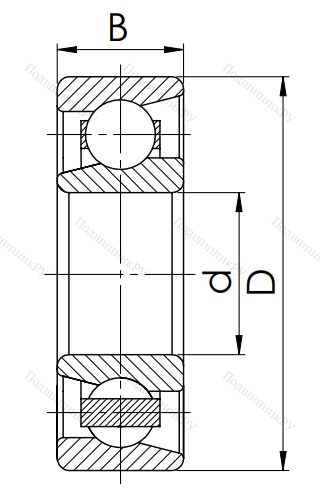 Это однорядный шарикоподшипник. Благодаря неразъемному исполнению выделяется надежностью, более низкой ценой по сравнению с разъемными. Угол контакта α=26°. Изделие воспринимает нагрузку вдоль оси до 150% от неиспользованной радиальной. Стальной сепаратор позволяет эксплуатировать узел в при рабочей температуре порядка +200° С.